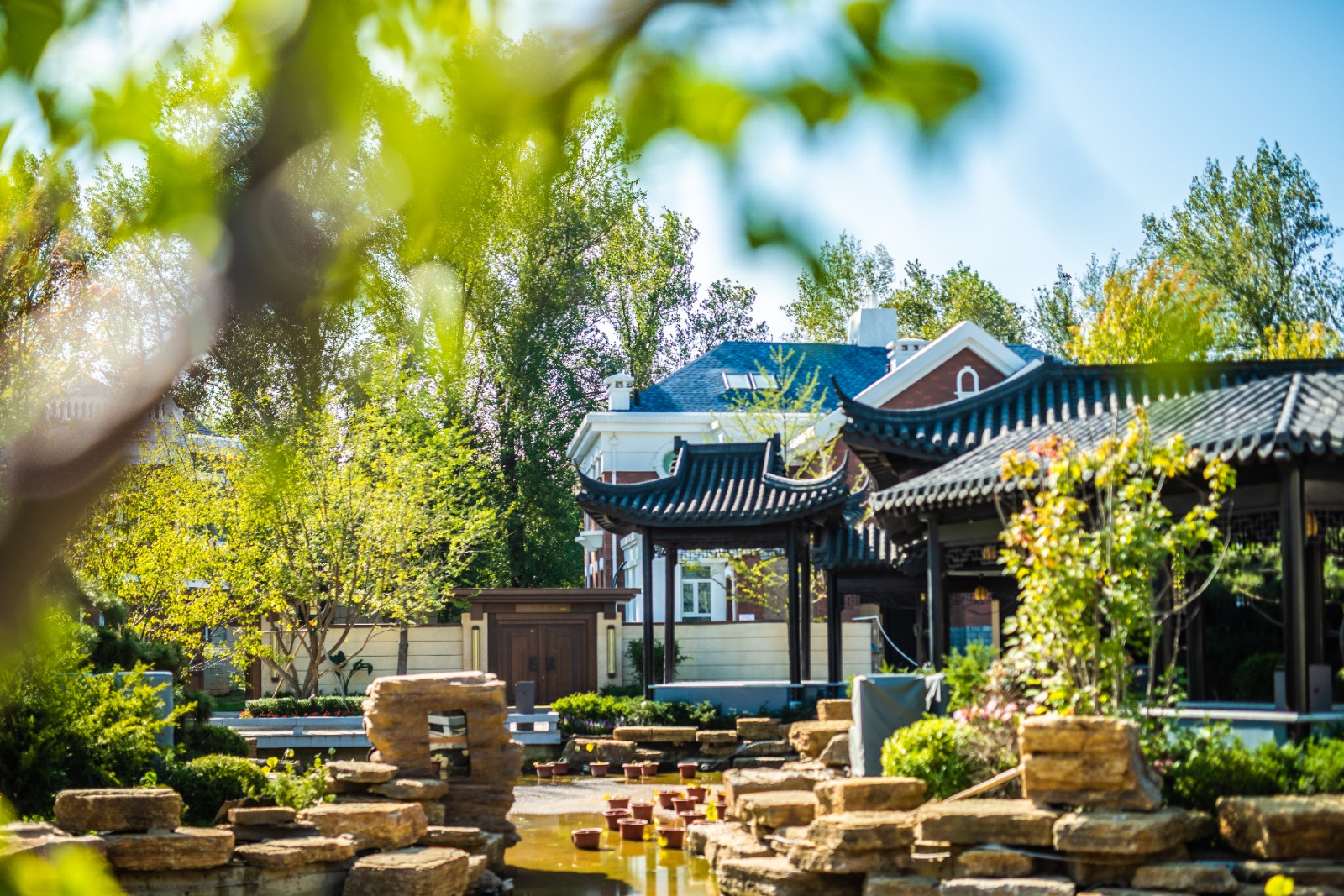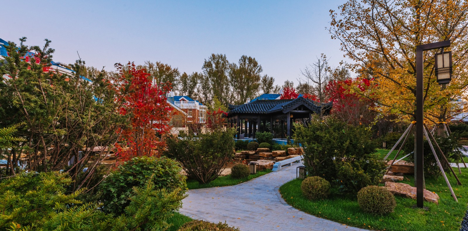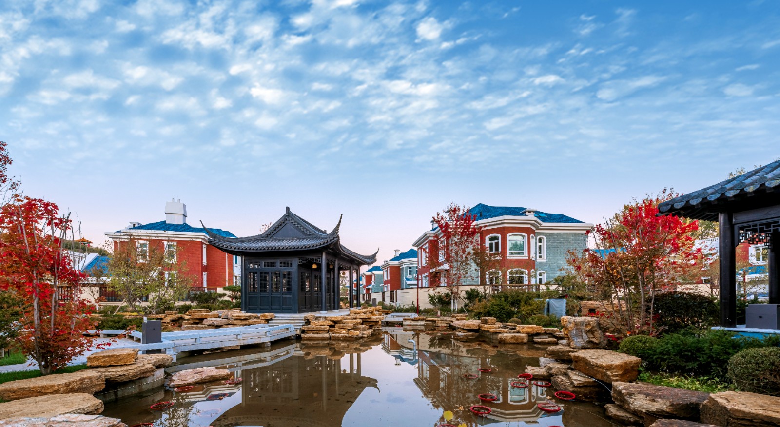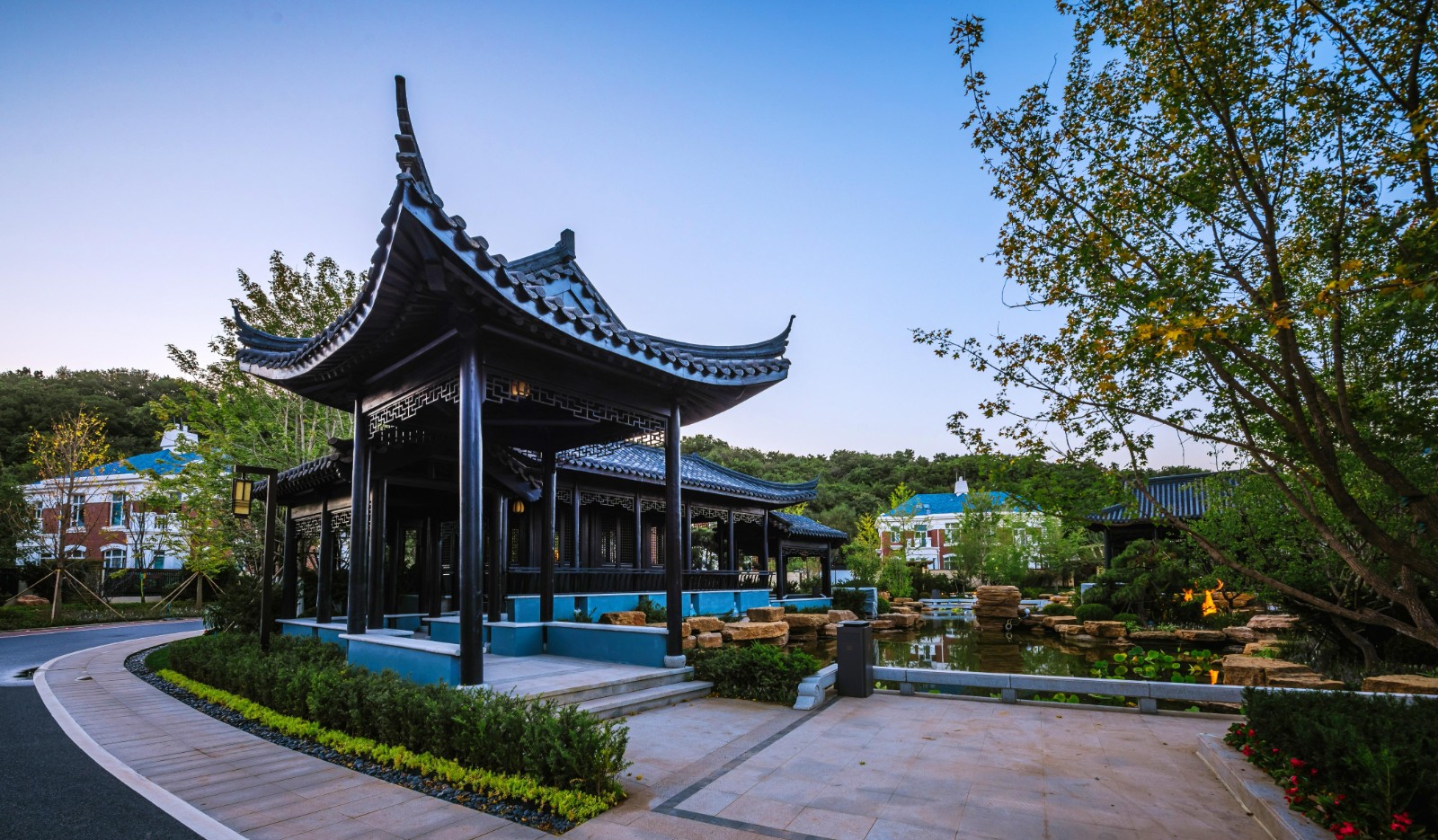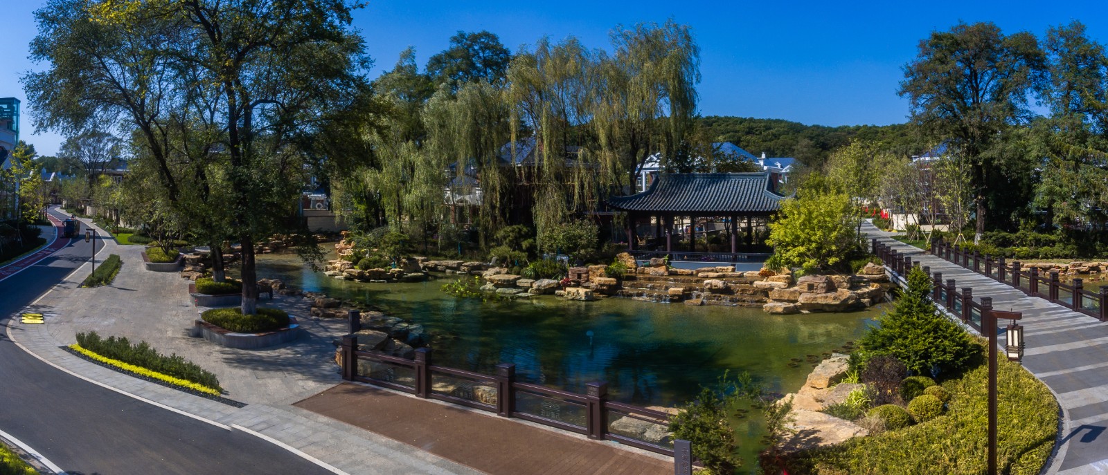 方迪山庄汲取传统东方人居园林中山水的精髓,内承袭苏州拙政园造园精粹,融入日本桂离宫元素中西合璧,因循内外之序,贯穿“一园八景”景观轴线,构建交流、互动的诗画意境。
