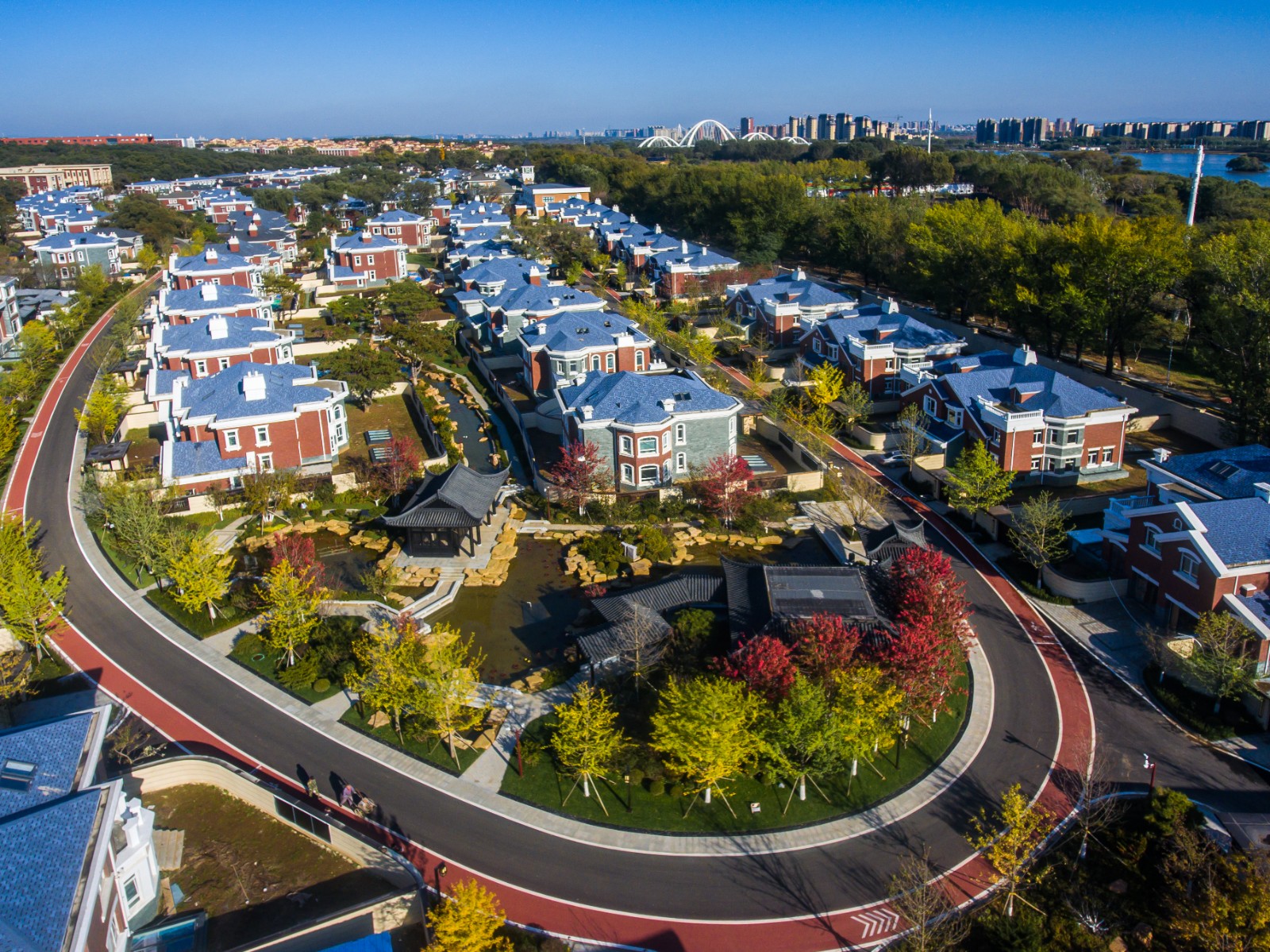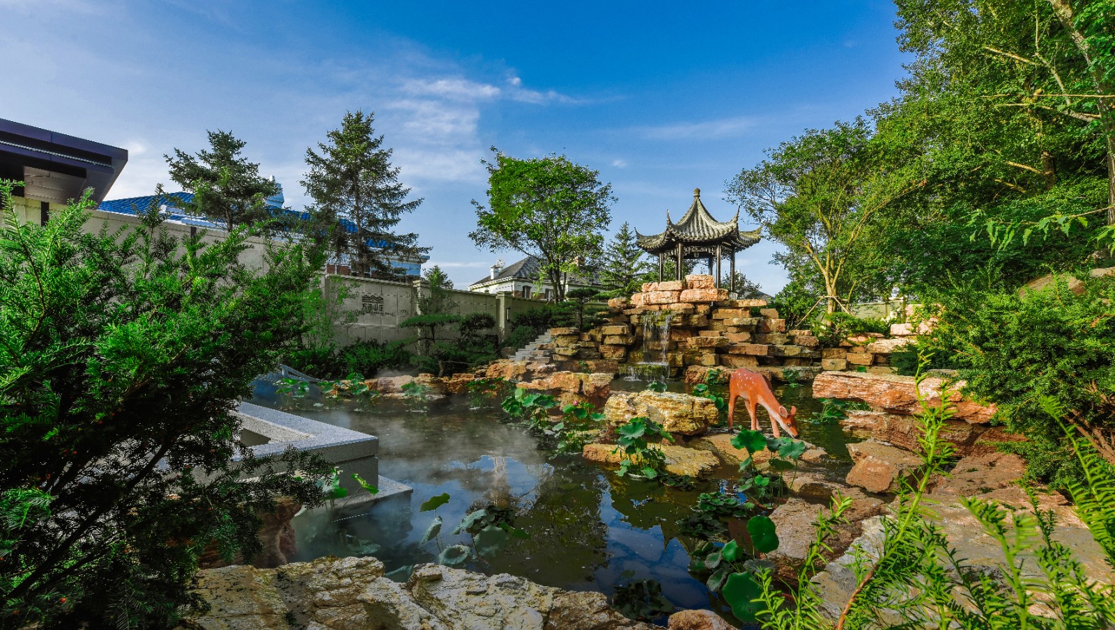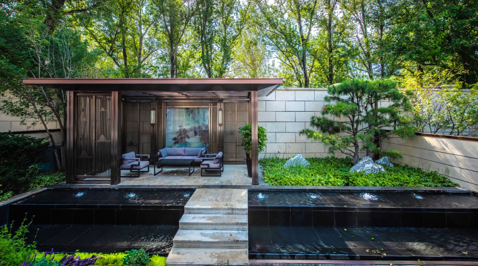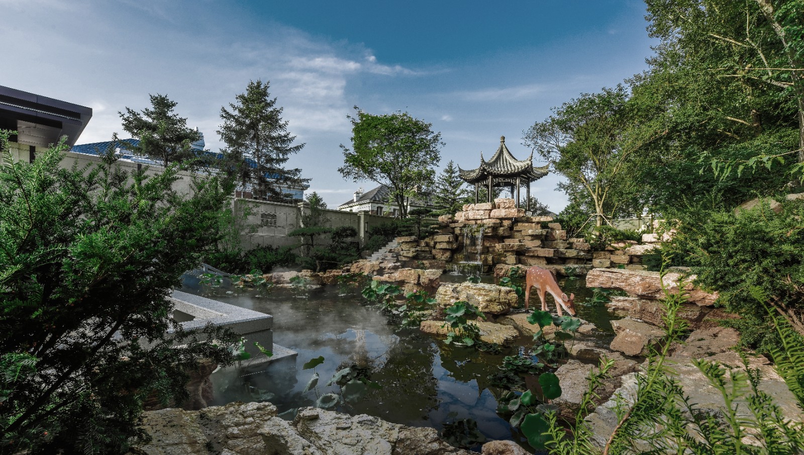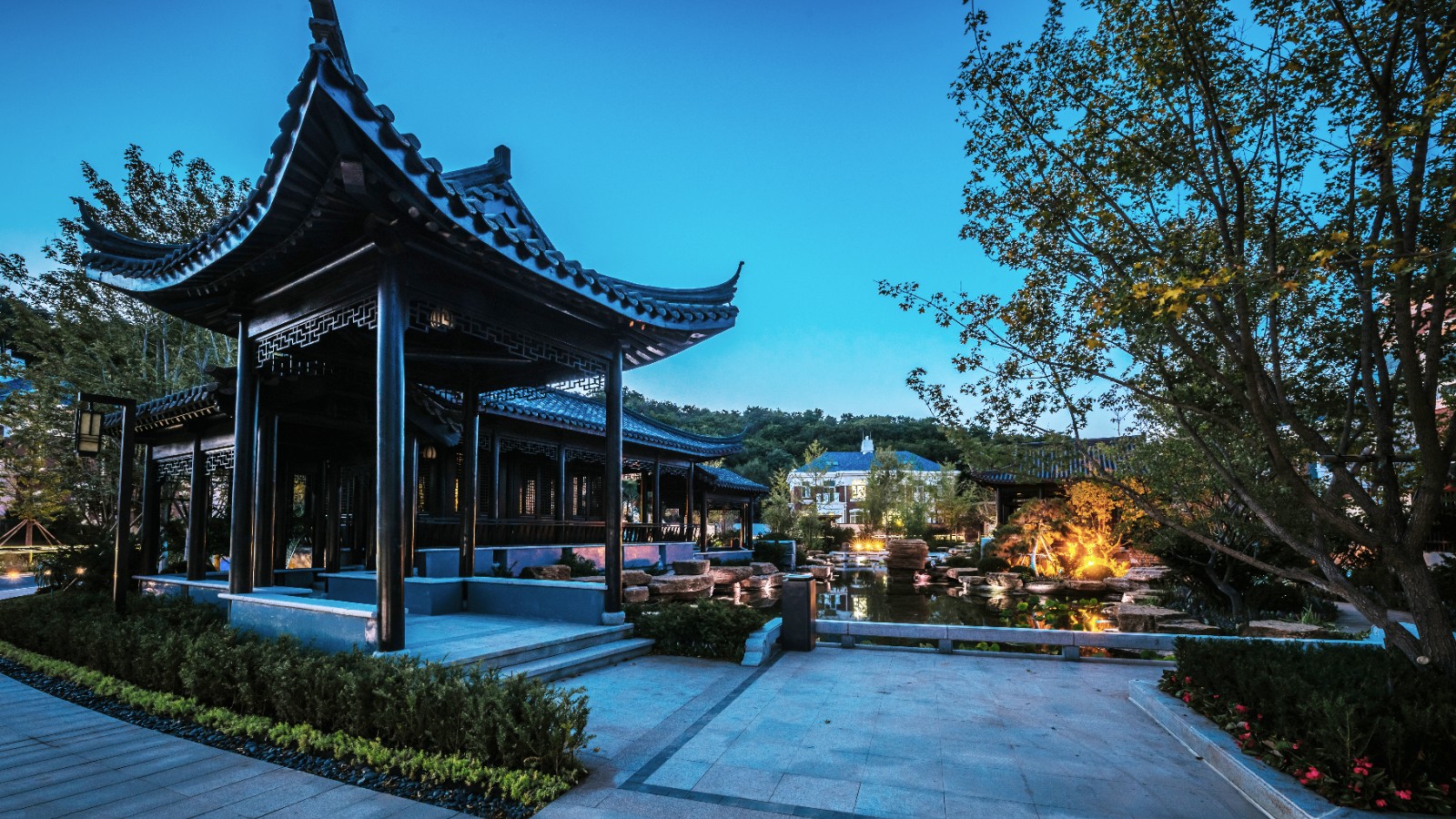 方迪山庄汲取传统东方人居园林中山水的精髓,内承袭苏州拙政园造园精粹,融入日本桂离宫元素中西合璧,因循内外之序,贯穿“一园八景”景观轴线,构建交流、互动的诗画意境。