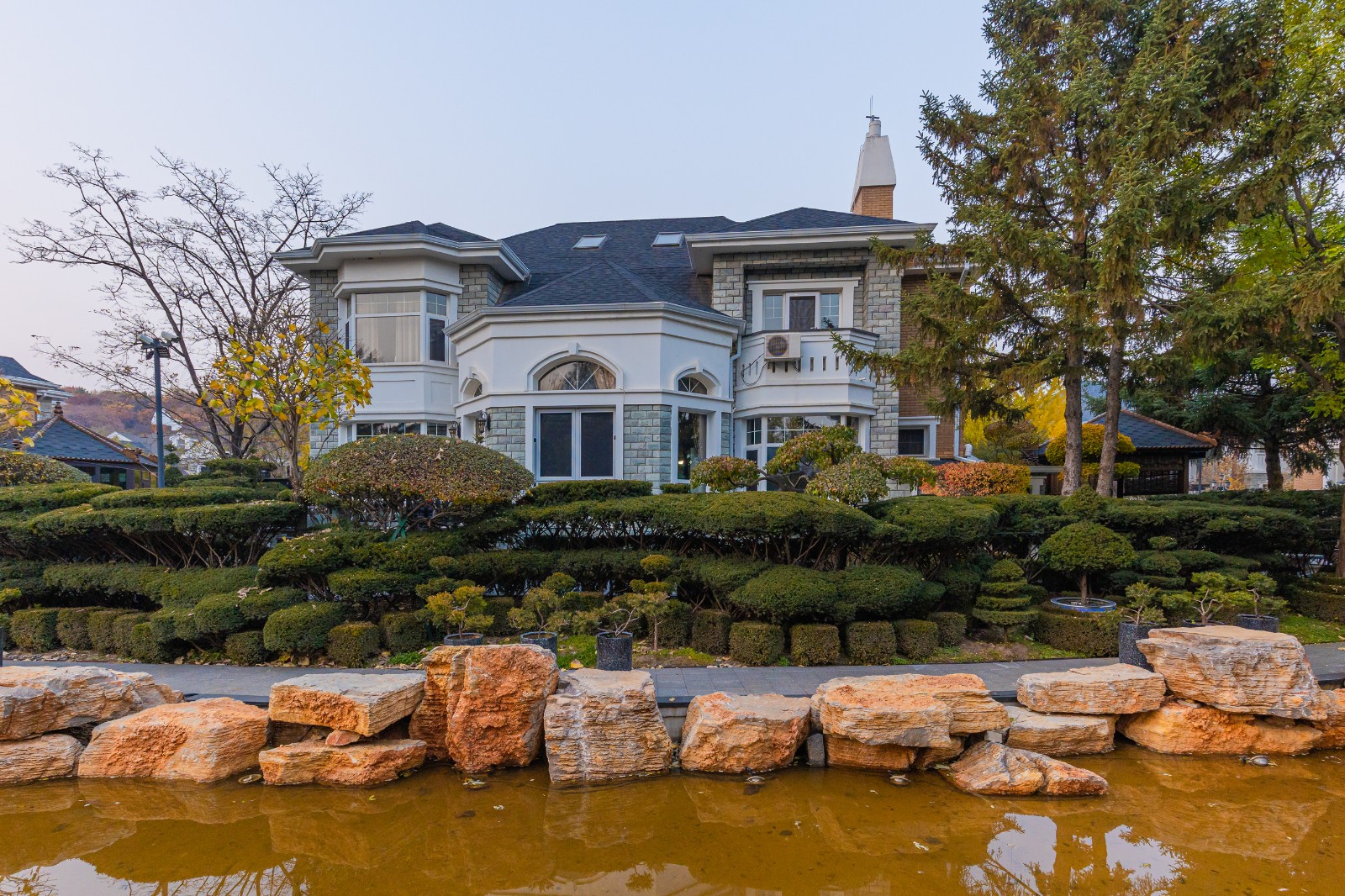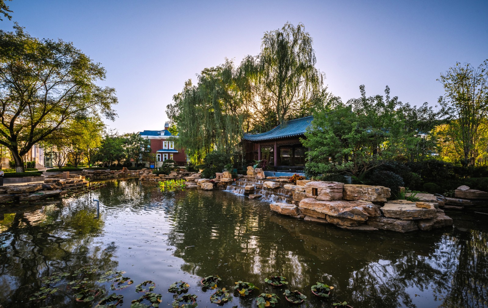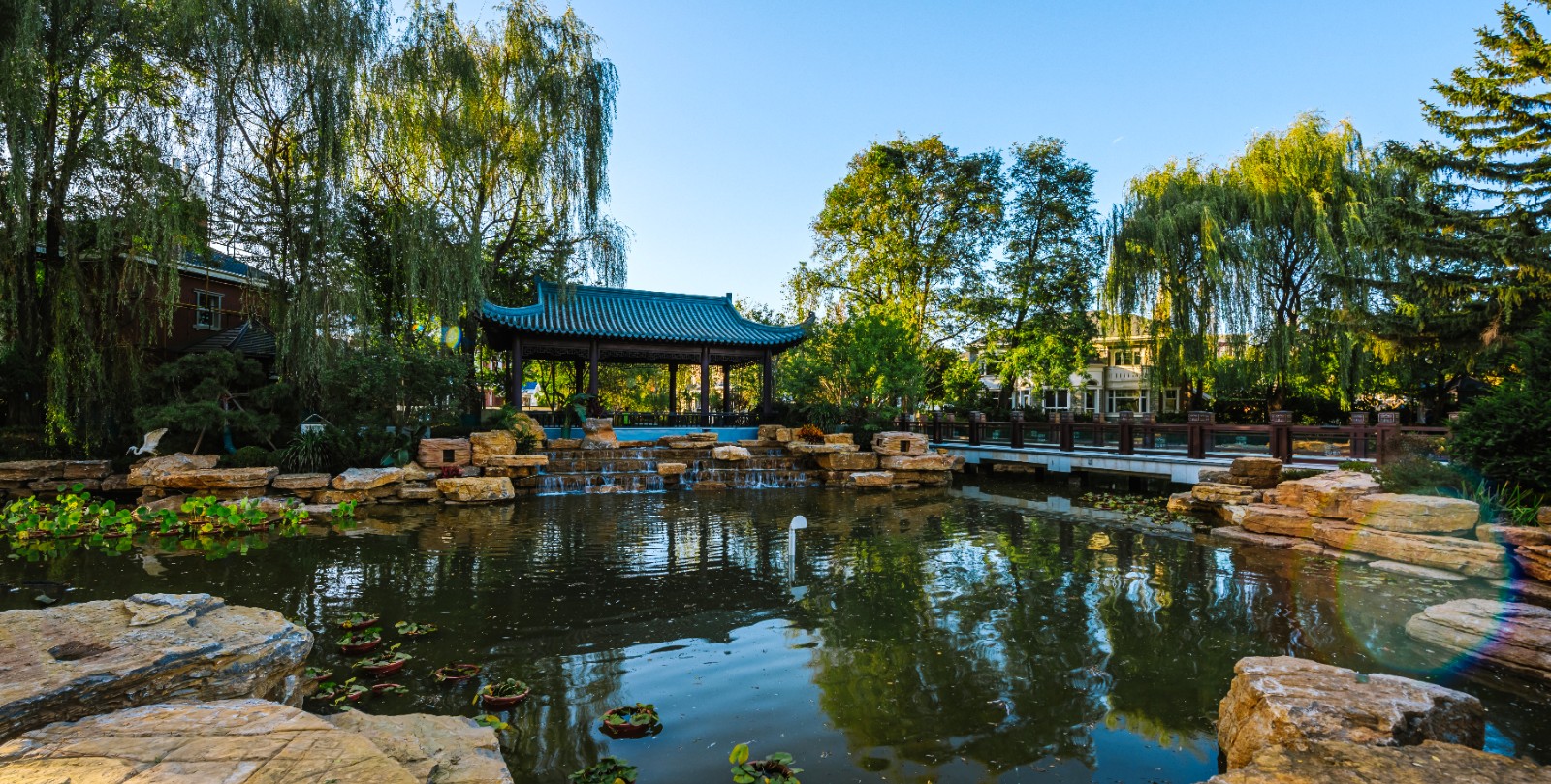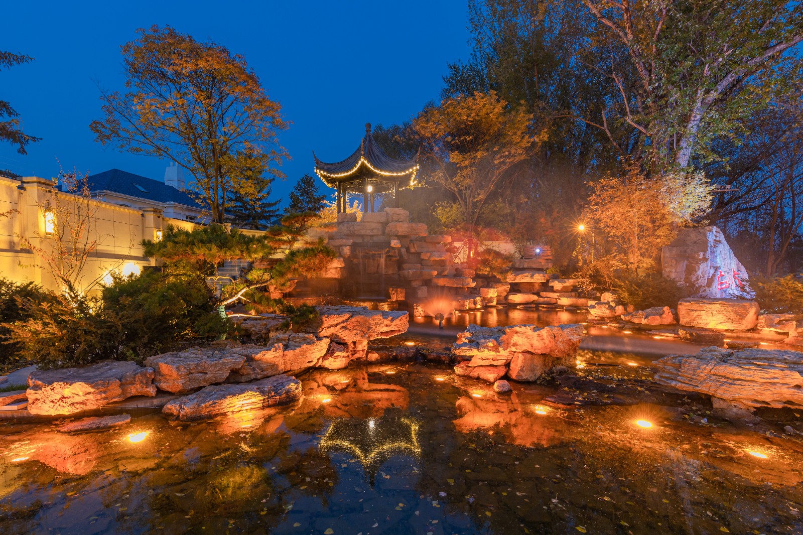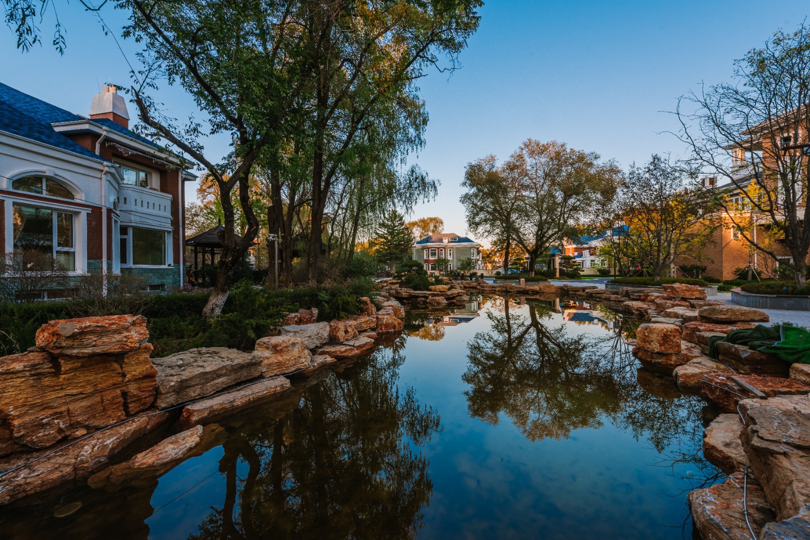 方迪山庄汲取传统东方人居园林中山水的精髓,内承袭苏州拙政园造园精粹,融入日本桂离宫元素中西合璧,因循内外之序,贯穿“一园八景”景观轴线,构建交流、互动的诗画意境。